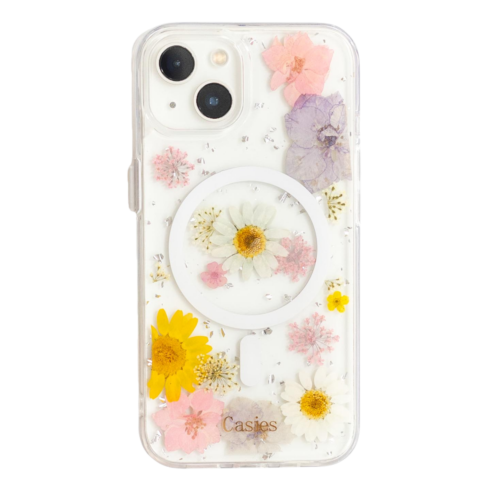 Zacht, speels en vol flower power – Bella is een ode aan kleine geluksmomentjes. Dit transparante hoesje is met de hand gevuld met echte droogbloemen in zachte tinten roze, lila, wit en zonnig geel. Van madeliefjes tot fijne veldbloemen: elk bloemetje is zorgvuldig geplaatst voor een dreamy, balanced look.