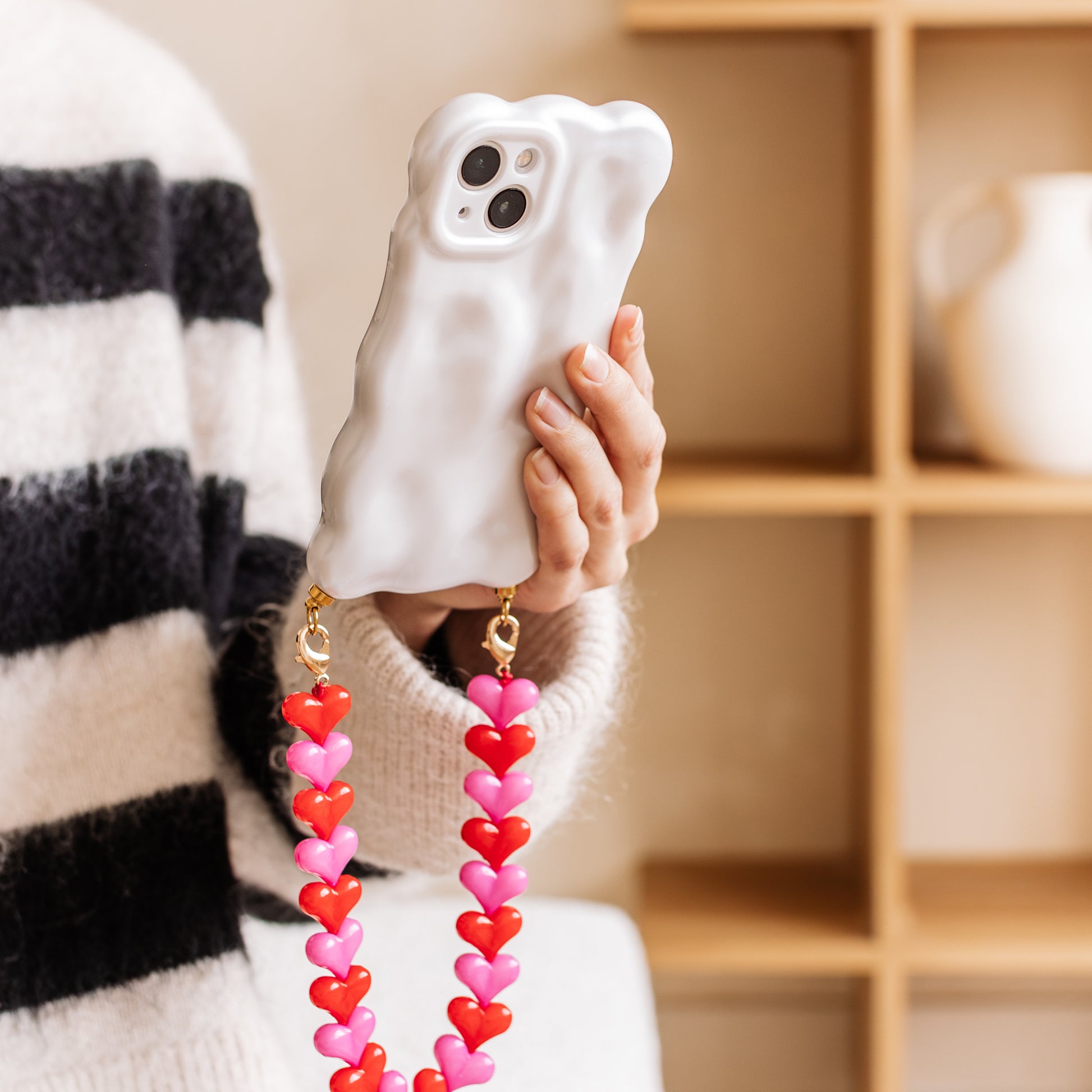Het echte showpiece? Het pink & red hearts telefoonkoord! Dit funky koord met glanzende hartjes in felrood en zachtroze is dé perfecte mix van cute en trendy. Of je nu onderweg bent of gewoon je telefoon handsfree wilt dragen, dit koord voegt niet alleen een dosis fun toe, maar is ook nog eens superpraktisch. De stevige gouden clips zorgen ervoor dat je het koord eenvoudig kunt losmaken of wisselen wanneer je wilt.
