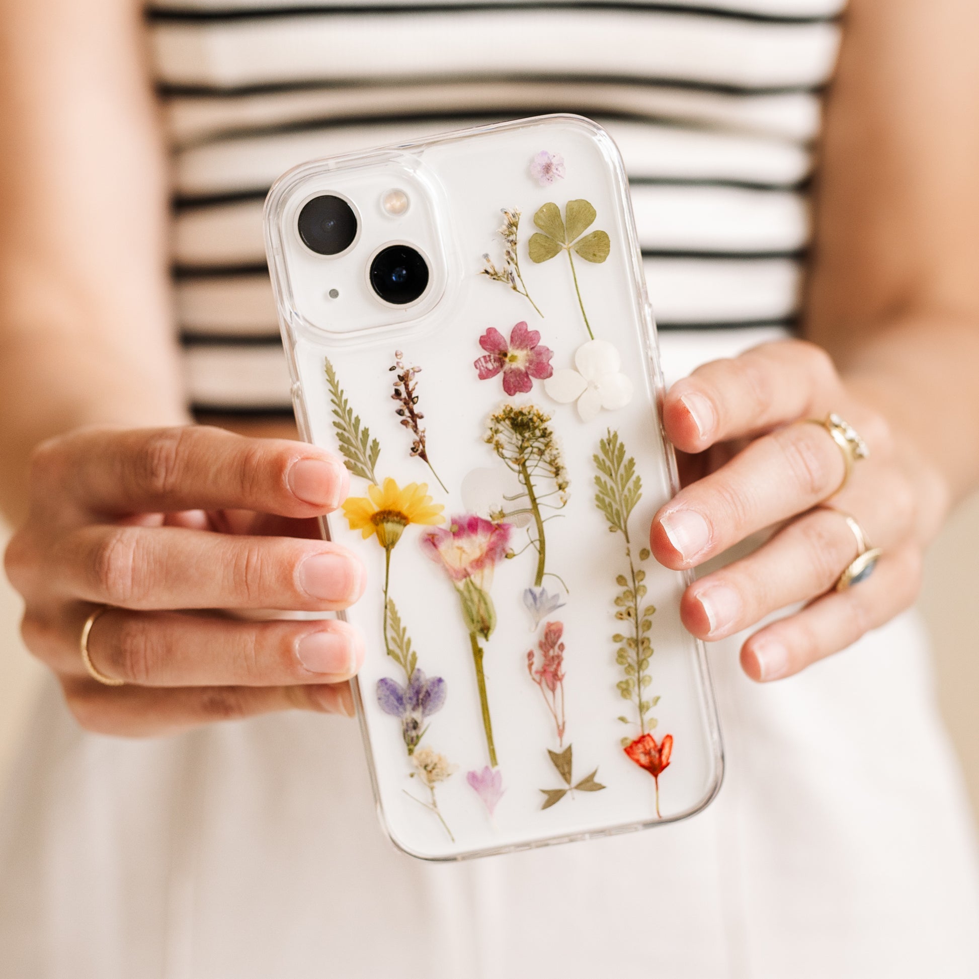 • Uniek en handgemaakt: Elk hoesje bevat echte gedroogde bloemen.